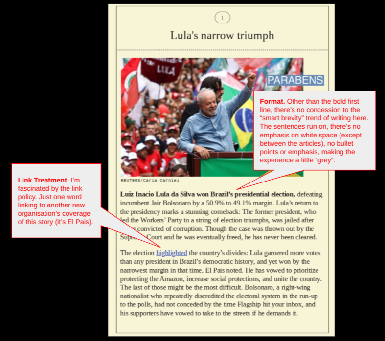“Lula’s big, narrow victory.” The news story selected for top billing, the victory of the challenger in Brazil’s election.